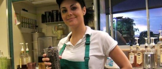 外に繋がれている犬が店内で注文している彼女の元へ走り寄りたくて猛烈に吠えながらジタバタし始めた。